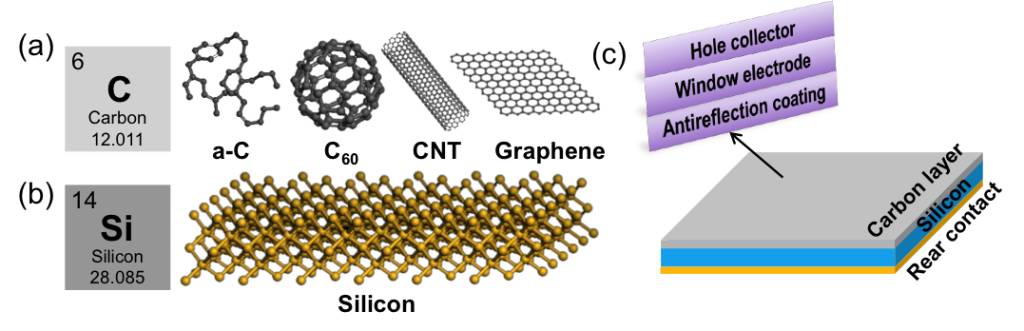 图2 (a) 碳与(b) 硅的结构示意图;(c) 碳/硅异质结太阳能电池的结构示意图