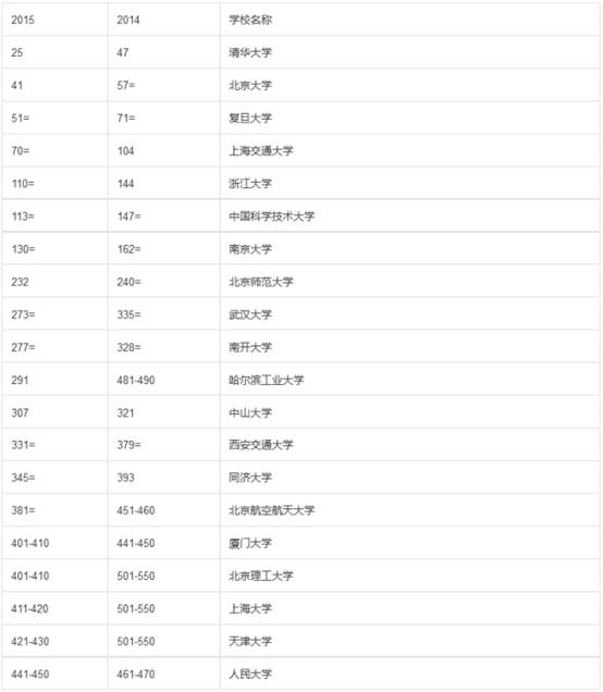 2015年9月14日,QS World University Rankings发布了2015-2016年度世界大学排名,英美院校独占前十的局面被打破,麻省理工学院依然一枝独秀,居世界大学第1名,英国4所院校跻身QS世界大学排名前十名,瑞士联邦理工学院意外入围世界大学前十名榜单,排行第9,清华北大分别位列第25和第47名。复旦大学上升20位排名第51,上海通大学上升34位排名第70。