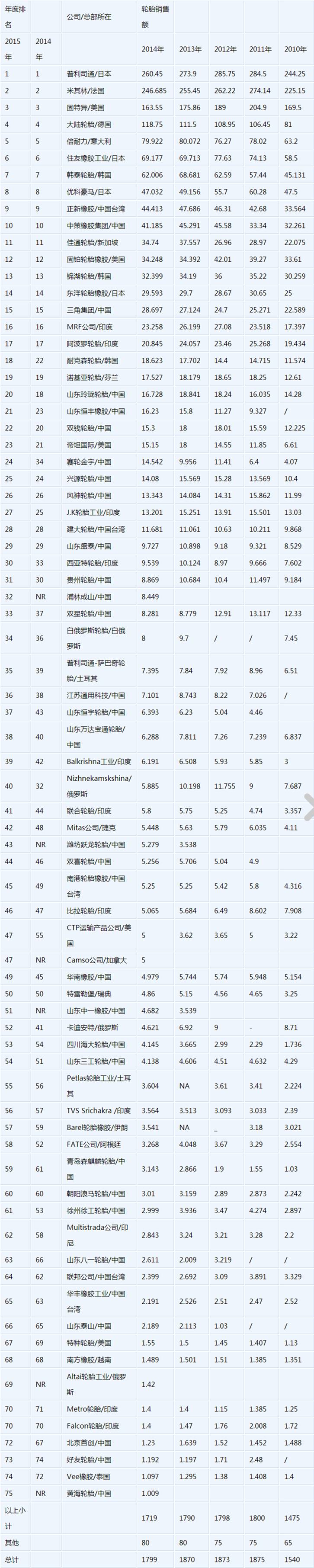 8月28日,美国《轮胎商业》公布了2015年度全球轮胎75强排行榜。该排行榜依惯例按企业2014年与轮胎制造有关联的销售额排名。全球轮胎市 场在经历上两年度“滞长”后进入下降通道,销售额下降3.8%;营业收入和净利润增长,但涨幅收窄。全球企业排名变化不大,轮胎兼并较少发生。轮胎项目投资在连续多年增长后出现下降,且有向亚洲转移的趋势。现橡胶及原油价格处于历史低位,轮胎销售价格呈下降趋势。预测2015年世界轮胎销售额继续下降6 %~8%。大多数轮胎制造商弱化销售额,着眼于提高营业利润。